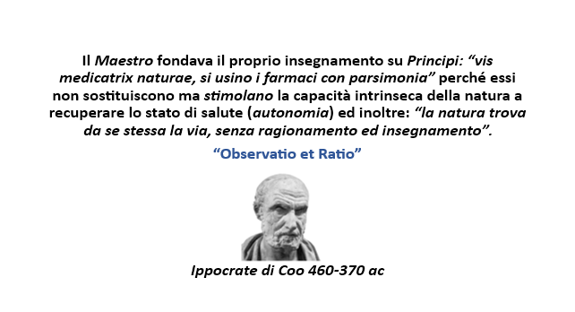 Il Maestro fondava il proprio insegnamento su Principi: “vis medicatrix naturae, si usino i farmaci con parsimonia” perché essi non sostituiscono ma stimolano la capacità intrinseca della natura a recuperare lo stato di salute (autonomia) ed inoltre: “la natura trova da se stessa la via, senza ragionamento e insegnamento”.